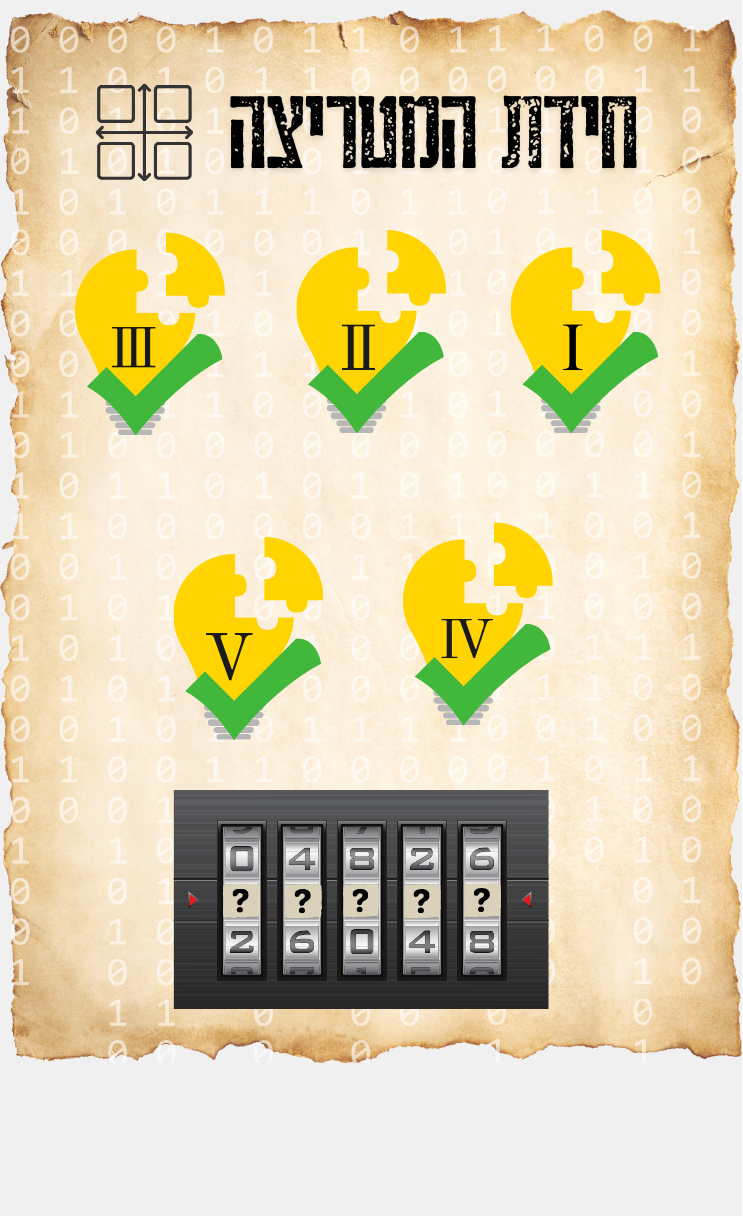 - שם תחכה להם חידת מטריצה סופית ומדליקה – פתרונה יחשוף את הקוד לקופסה השקופה והמסתורית שניצבת מולכם לכל אורך המשחק.